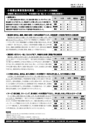 更新日:2026/01/30| Category:商工会情報 小規模企業景気動向調査(令和7年12月実施)の調査結果について facebook Twitter Google+ 全国の商工会指導員が回答しました小規模企業景気動向調査の令和7年12月実施分を掲載いたします。 栃木県や貴事業所の状況との比較などにご利用ください。 関連資料 » 小規模企業景気動向調査(令和7年12月実施)